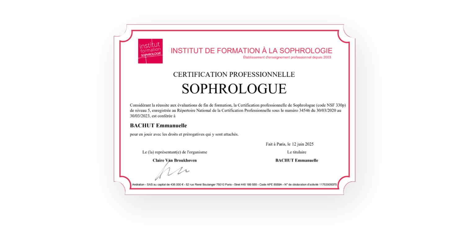 Un burn-out m’a menée à m’interroger sur le sens de mon travail et sur l’importance de préserver mon équilibre personnel. C’est dans ce cheminement que j’ai découvert la sophrologie : une pratique douce et puissante à la fois, qui m’a permis de retrouver confiance, énergie et clarté.